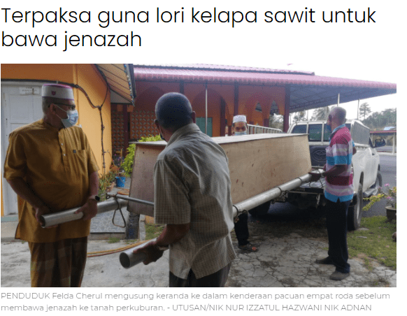 Setiap kali berlakunya kematian, pihak pengurusan jenazah terpaksa meminjam lori kelapa sawit atau kenderaan pacuan empat roda untuk membawa jenazah ke tanah perkuburan.